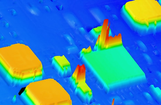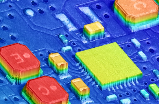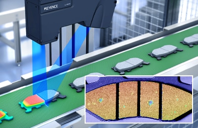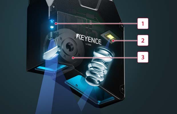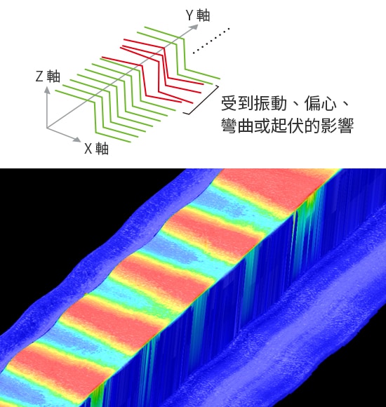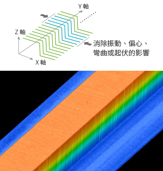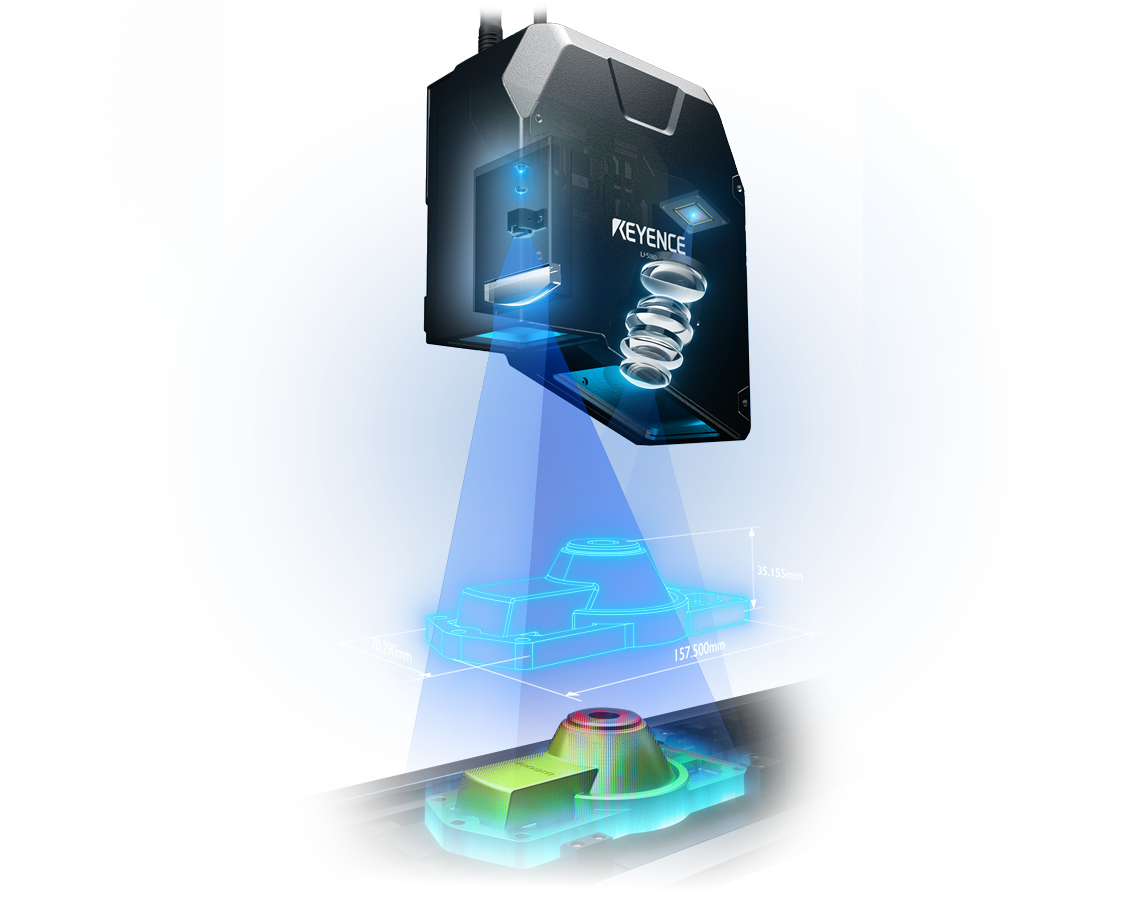 使用光切法的雷射位移計(jì)(2D、3D)。以線型雷射光照射目標(biāo)物表面,再以CMOS接收其反射光的變化,以非接觸形式量測(cè)高度、高低差、寬度、平面度等輪廓(截面形狀)。對(duì)連續(xù)取得之輪廓資料進(jìn)行影像處理,取得3D形狀,實(shí)現(xiàn)高精度量測(cè)與全檢。而且,KEYENCE的全新自動(dòng)掃描3D感測(cè)器能夠在短短零點(diǎn)幾秒內(nèi)對(duì)靜止目標(biāo)物進(jìn)行高精度的3D外觀檢查,使其能在更多情況下進(jìn)行檢查。