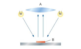 同軸照明的光走向與鏡頭的光學(xué)路徑一致。同軸落射照明是透過半反射鏡,讓照射到目標(biāo)物的光軸與鏡頭光軸平行。此照明方法在觀察鏡面加工的金屬表面或光滑的塑膠表面,以及類似半導(dǎo)體晶圓的鏡面反射目標(biāo)物時(shí)使用,或者在觀察目標(biāo)物的結(jié)構(gòu)和表面光澤的差異,而非形狀時(shí)使用。