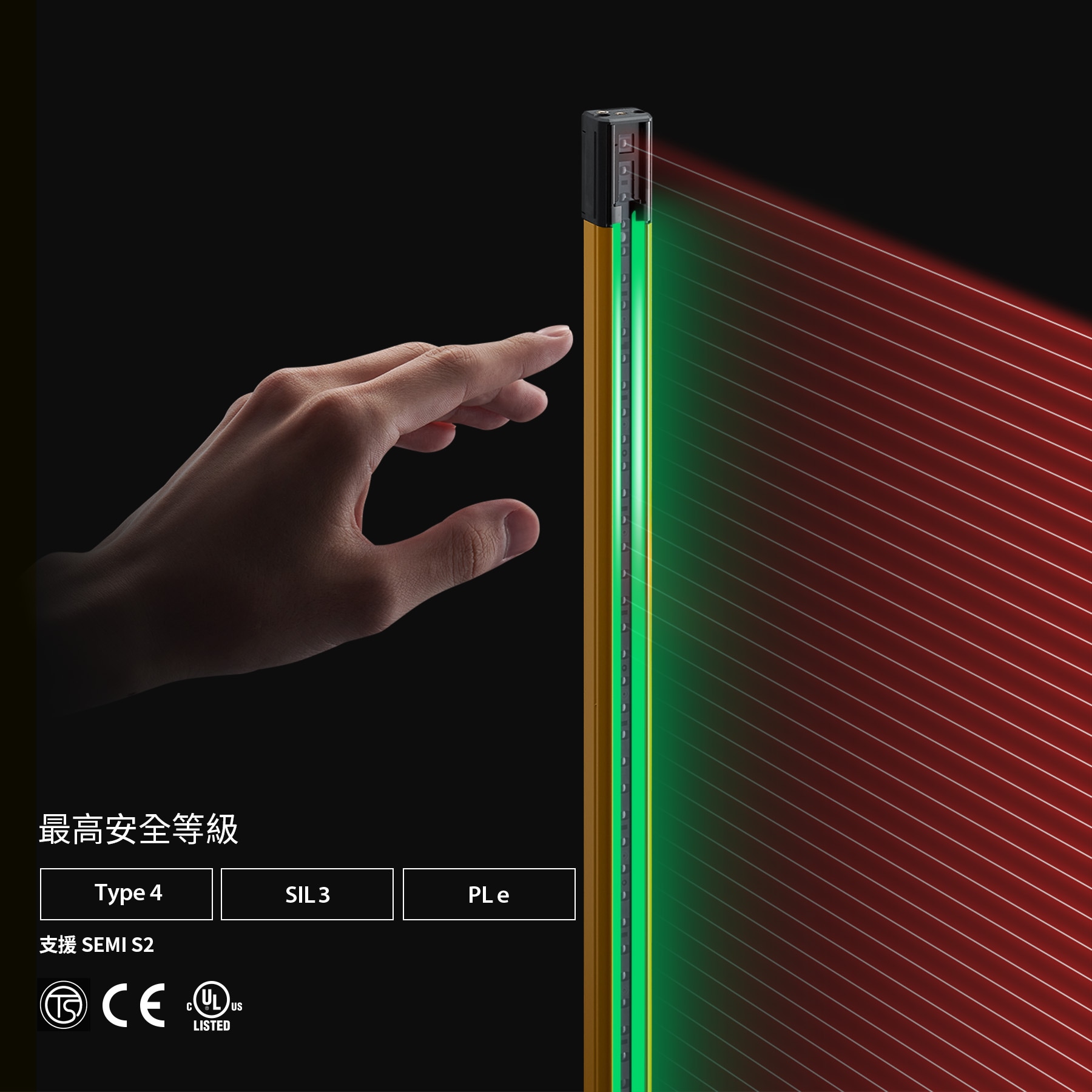 安全光柵GL-V 系列搭載大型線狀指示燈,僅靠本體即可清楚顯示狀態(tài)。當(dāng)入光時(shí)顯示綠色,遮光時(shí)顯示紅色,即使從遠(yuǎn)處也能一眼辨識(shí)光柵是否遮光,有助於迅速復(fù)原作業(yè)。此外,透過顯示模式還可確認(rèn)受光量降低或錯(cuò)誤狀態(tài),便於及早採取對策。GL-V 系列可廣泛應(yīng)用於設(shè)備啟動(dòng)、調(diào)整與運(yùn)轉(zhuǎn)階段。雖然尺寸僅為22 mm × 22 mm,卻具備約3 mm 厚的堅(jiān)固外殼結(jié)構(gòu),展現(xiàn)高耐用性。重新設(shè)計(jì)的內(nèi)部光學(xué)構(gòu)造更支援最長15 公尺的檢測距離。