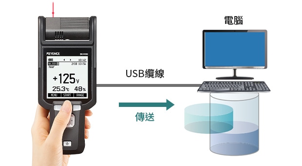 量測(cè)到的數(shù)據(jù)可記錄在主體的內(nèi)部緩衝記憶體,最多記憶100組數(shù)據(jù)。記錄的數(shù)據(jù)可用USB纜線傳送至電腦,以CSV數(shù)據(jù)儲(chǔ)存。